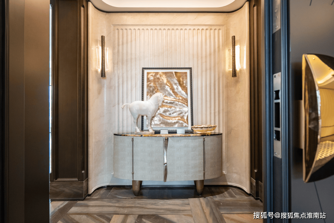 电梯厅的宠物识别按钮是艺术家定制款;入户门把手出自艺术家刘建华之手,用整块实心铜锭经锻造、打磨、电镀等多道精密工艺制成,握住的瞬间就是与艺术的触碰
