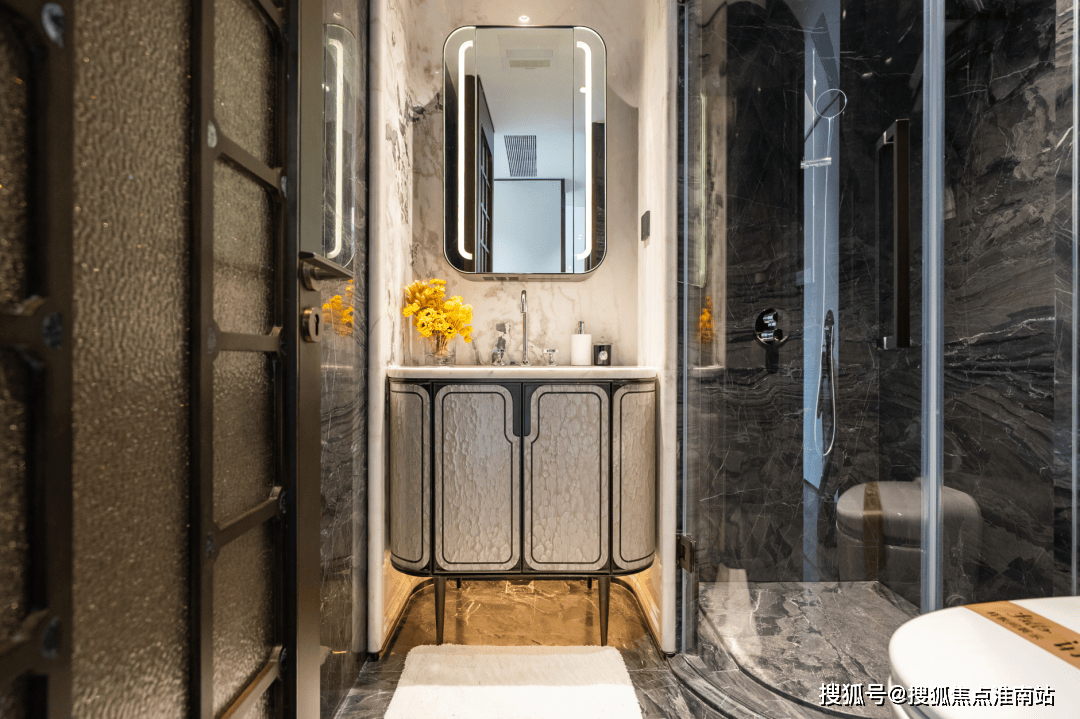 电视背景墙选用意大利超白洞石材;卫生间台面及墙面采用芬迪白;来自巴西进口的静雅棕石材在有些顶豪中仅用于卫生间点缀,而在绿城黄浦ONE,则将其大量运用于地面铺装