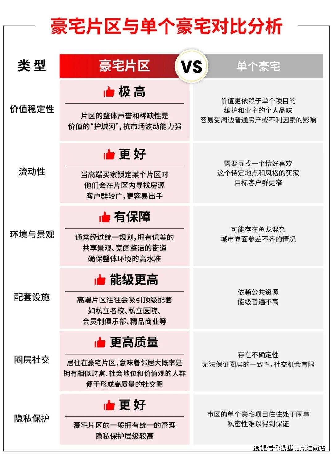 在价值稳定性、流动性、环境与景观、配套设施、圈层、隐私等维度,小胖君做了两者的对比,供大家参考: