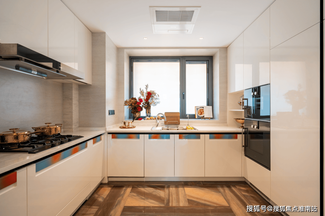 同时项目首创的“艺术柜体”,把艺术家陈亮的“大山水”作品镶嵌在橱柜门把手上;主卧背景墙更是定制款画作与高级木饰面的巧妙拼接