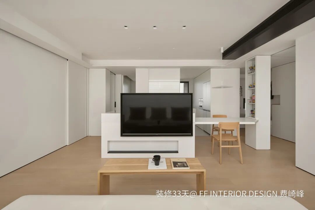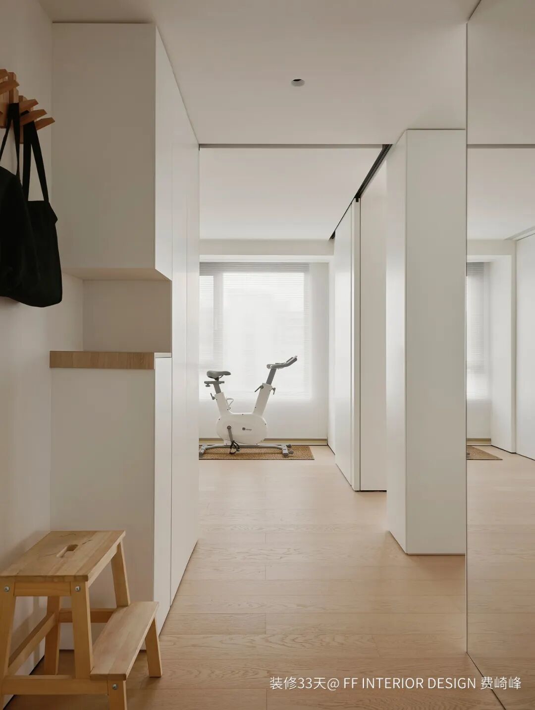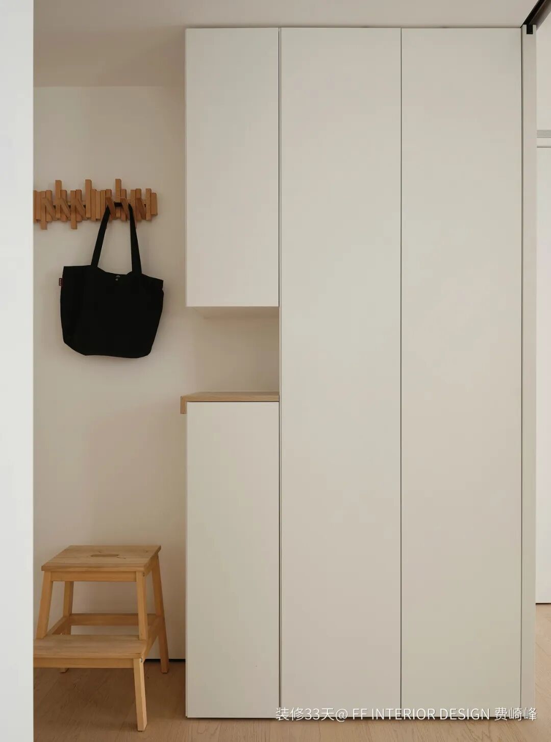 ▲ 推门而入,一组极简白色柜体映入眼帘,木质换鞋凳与挂钩暖调相融,让归家更有温度