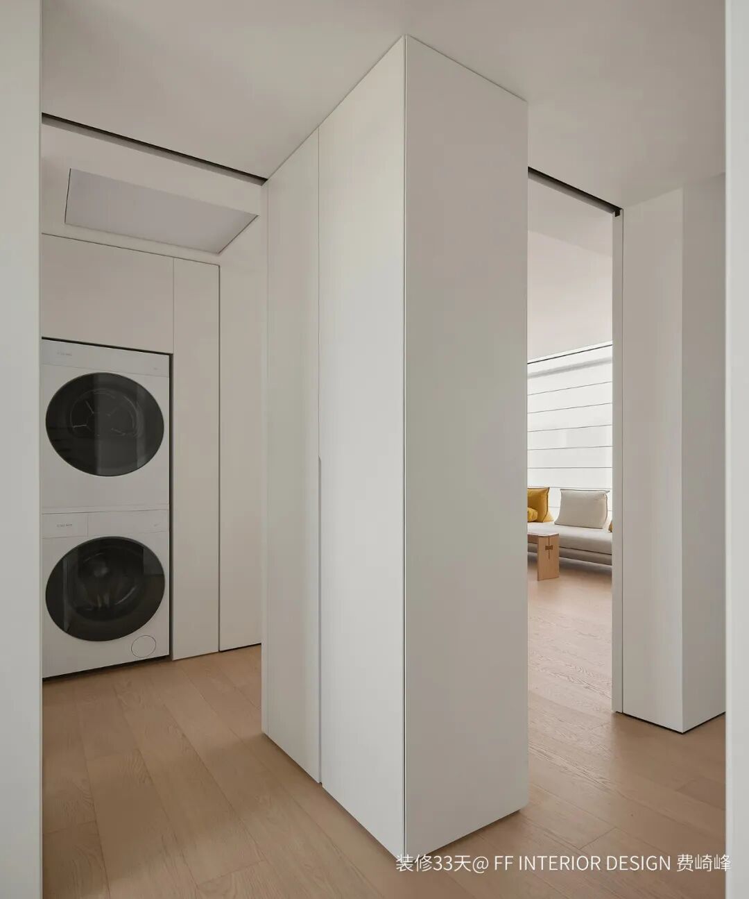 ▲ 过道设置高柜嵌入洗衣机和烘干机,整洁又美观。主卧入口被“融”进了一面柜体中,移门与衣柜融为一体