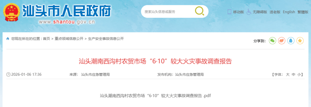 查看详情U8.COM·(中国区)有限公司官网据新华社消息,广东省汕头市人民政府门户网站1月6日公布“汕头潮南西沟村农贸市场‘6·10’较大火灾事故调查报告”。报告显...