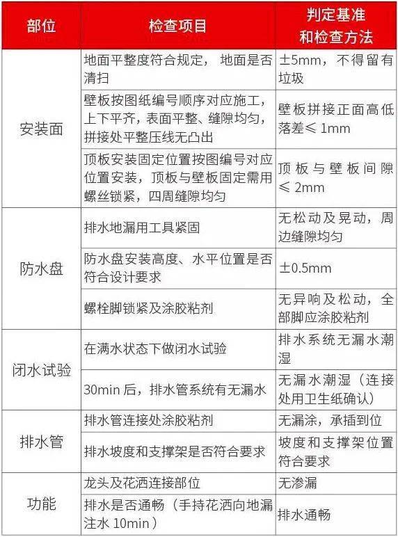 针对装配式卫生间的施工质量,可以依据其施工特性,从安装面、防水盘、闭水试验、排水管、功能等五大验收,进行层层把关,以确保施工质量。