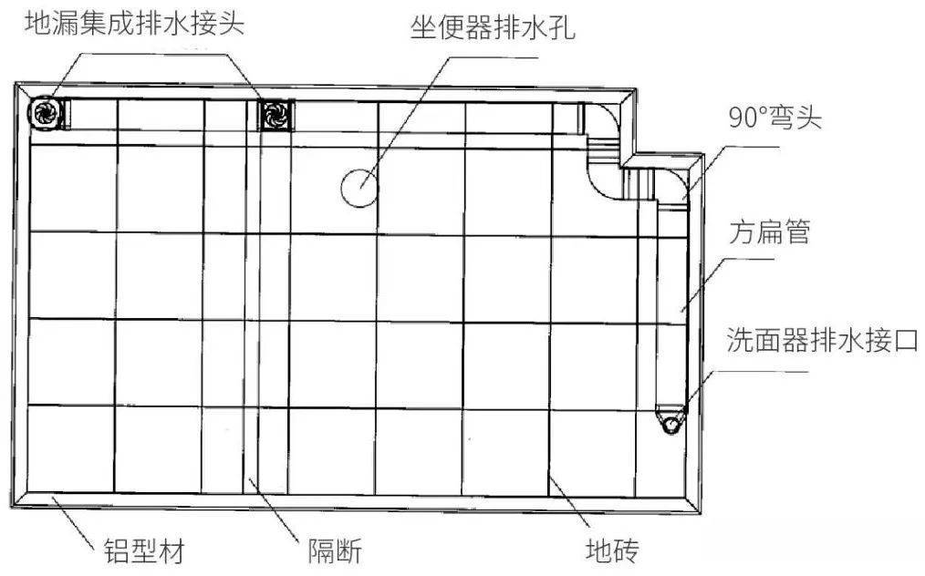 如采用同层不降板排水,需提前预埋排水汇集器(集成水封),干湿地漏、洗脸盆接入集成水封,后排水座便器单独排放接入立管,汇集水封带有应急积水排放口。